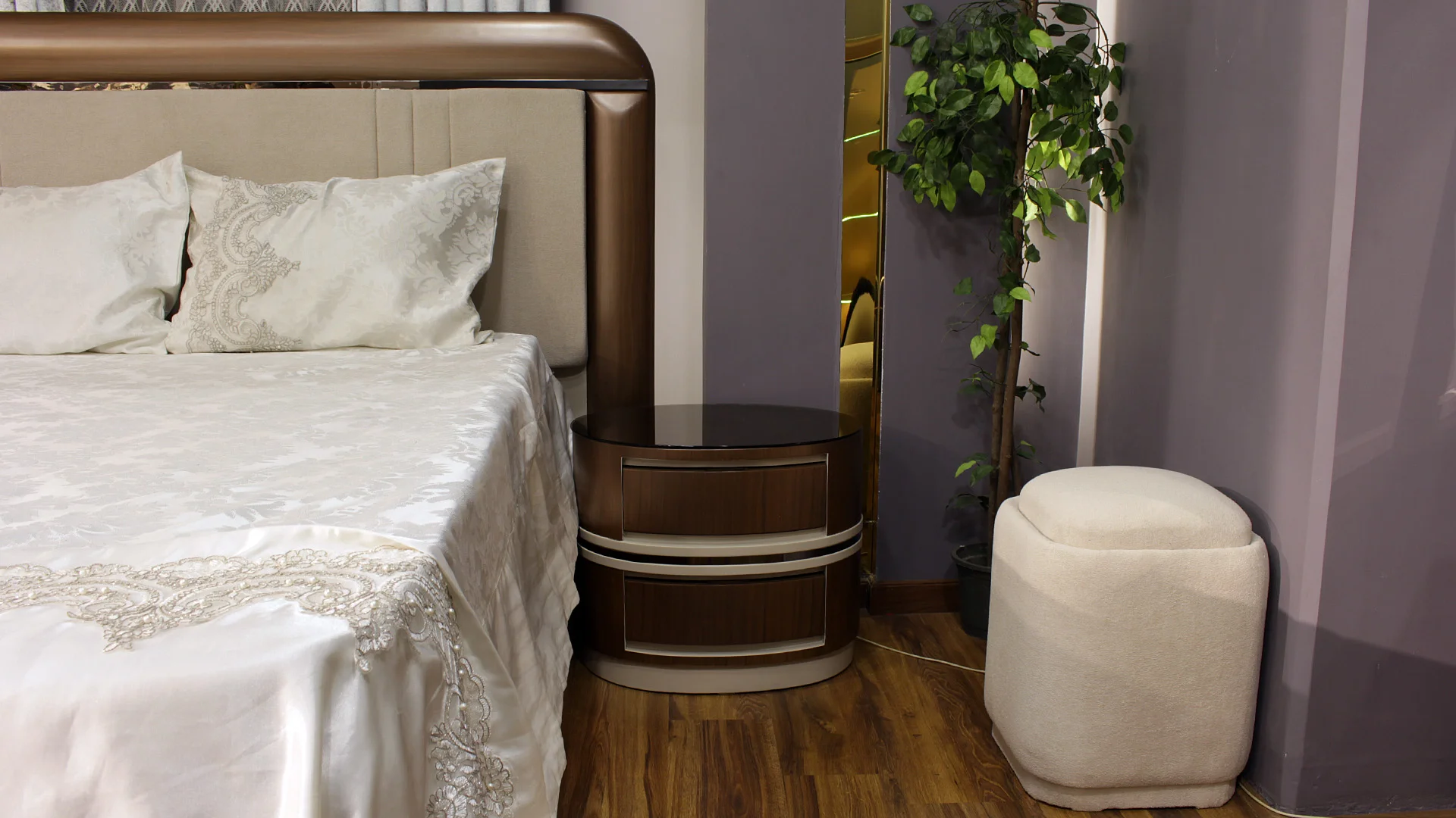 - غرفة نوم حديثة لها طابع خاص في شكلها وإمكانيتها. لها تصميم أملس جذاب، يتمثل بانحناءات ملساء في معظم جوانب الغرفة.