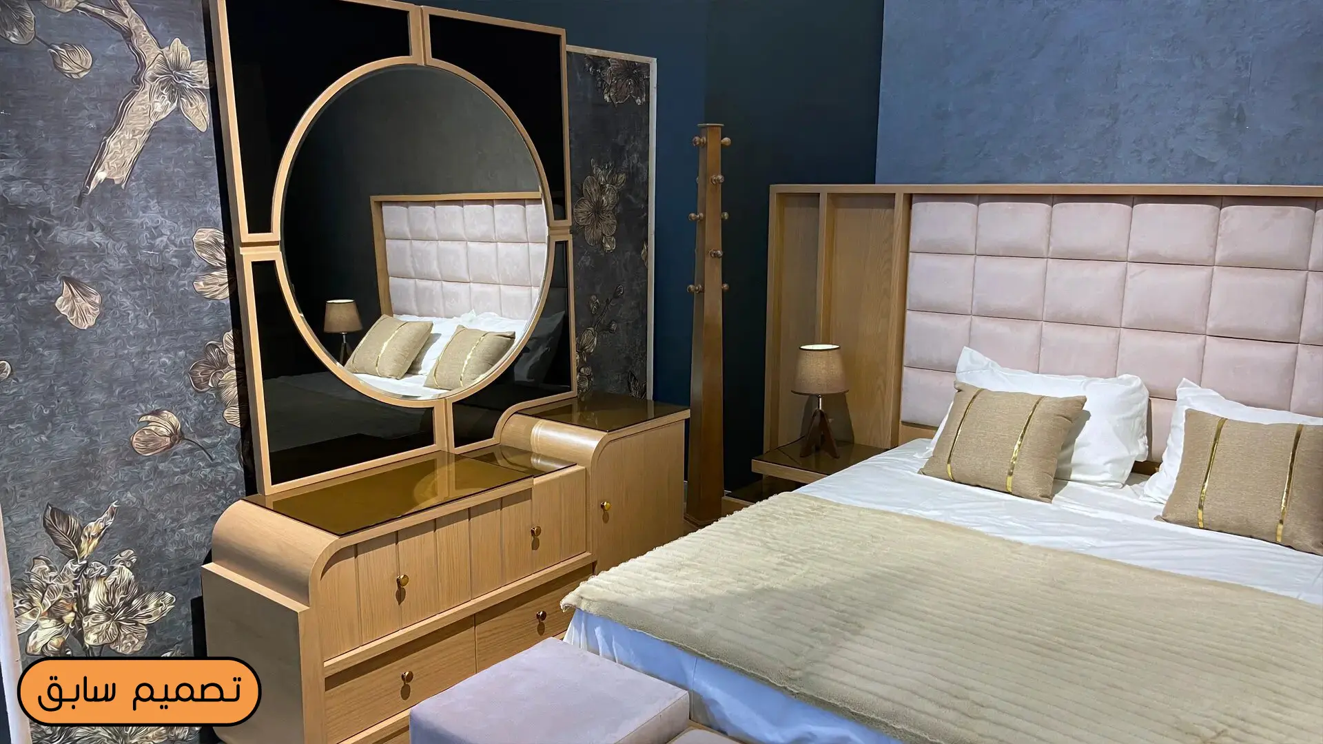 - سرير كبير معه بانكيت، 2 كمود، دولاب كبير،تسريحه وبف.