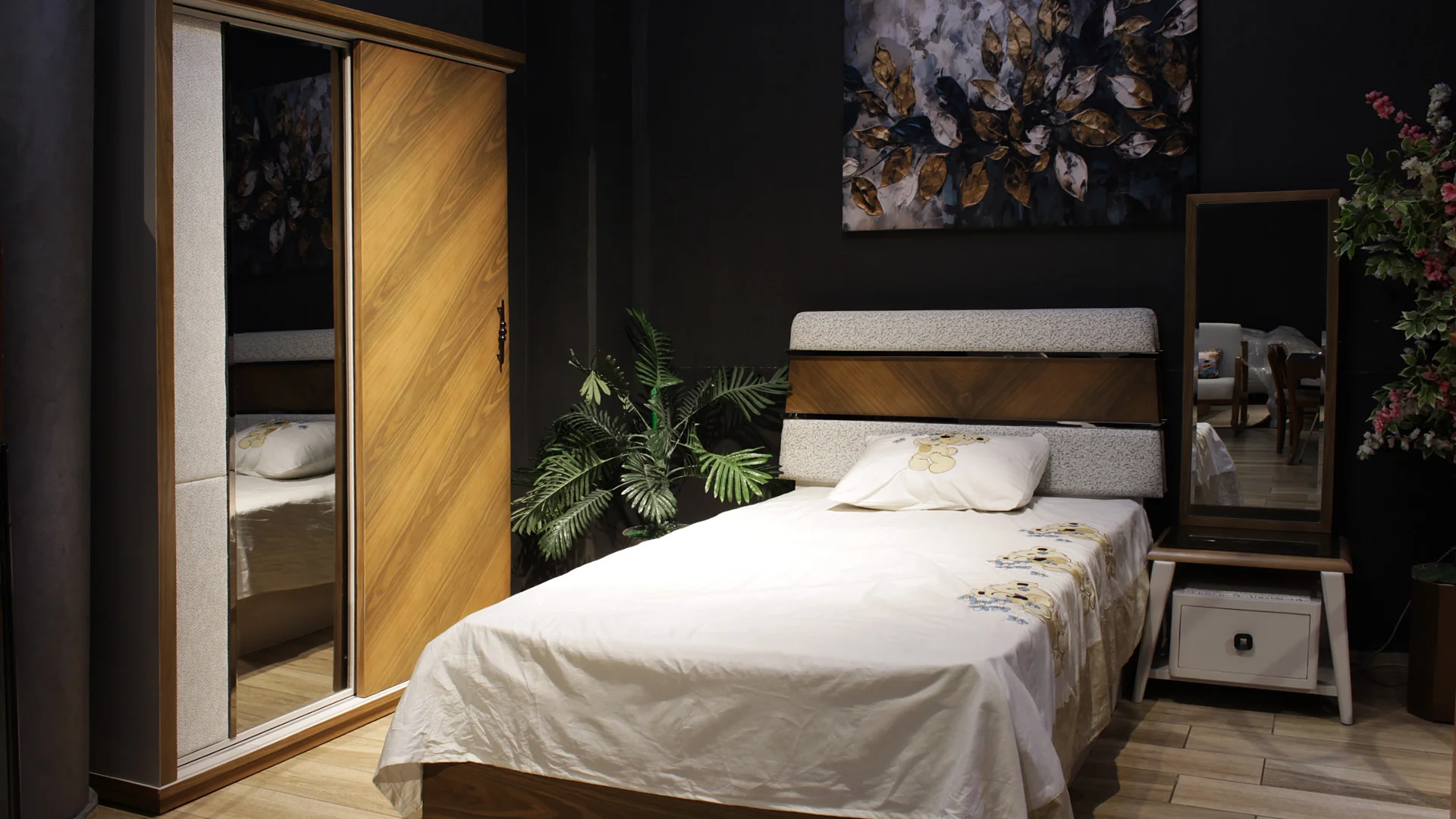 - سريران حجم صغير، كمود مرآة طولية، دولاب جرار.