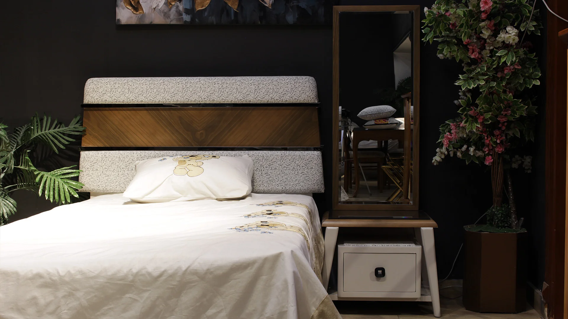 غرفة شبابية بتصميم أنيق جدا، ويظهر ذلك في دمج لون الكافيه مع القشرة الطبيعية مع الجلد الاوف وايت المزرقش ليتكون لك مزيج مريح للعينين وجذاب.