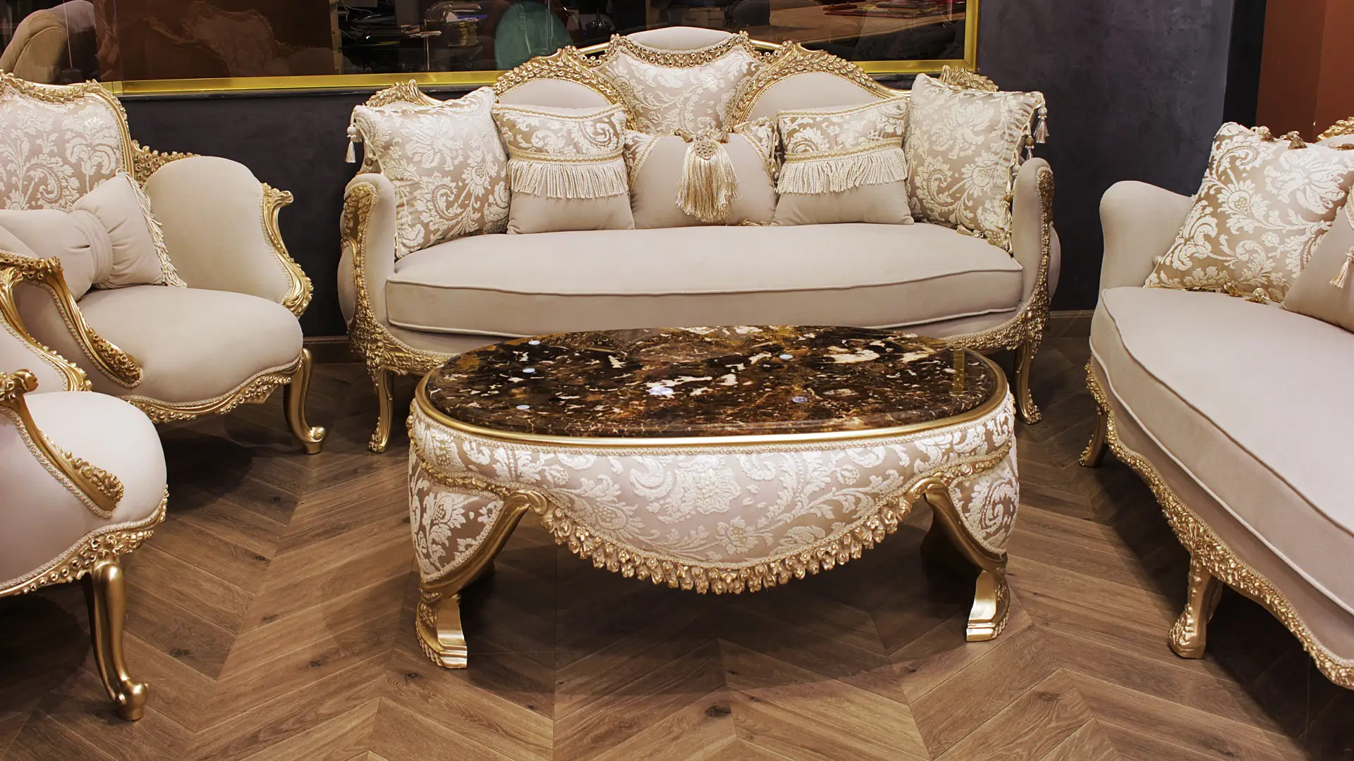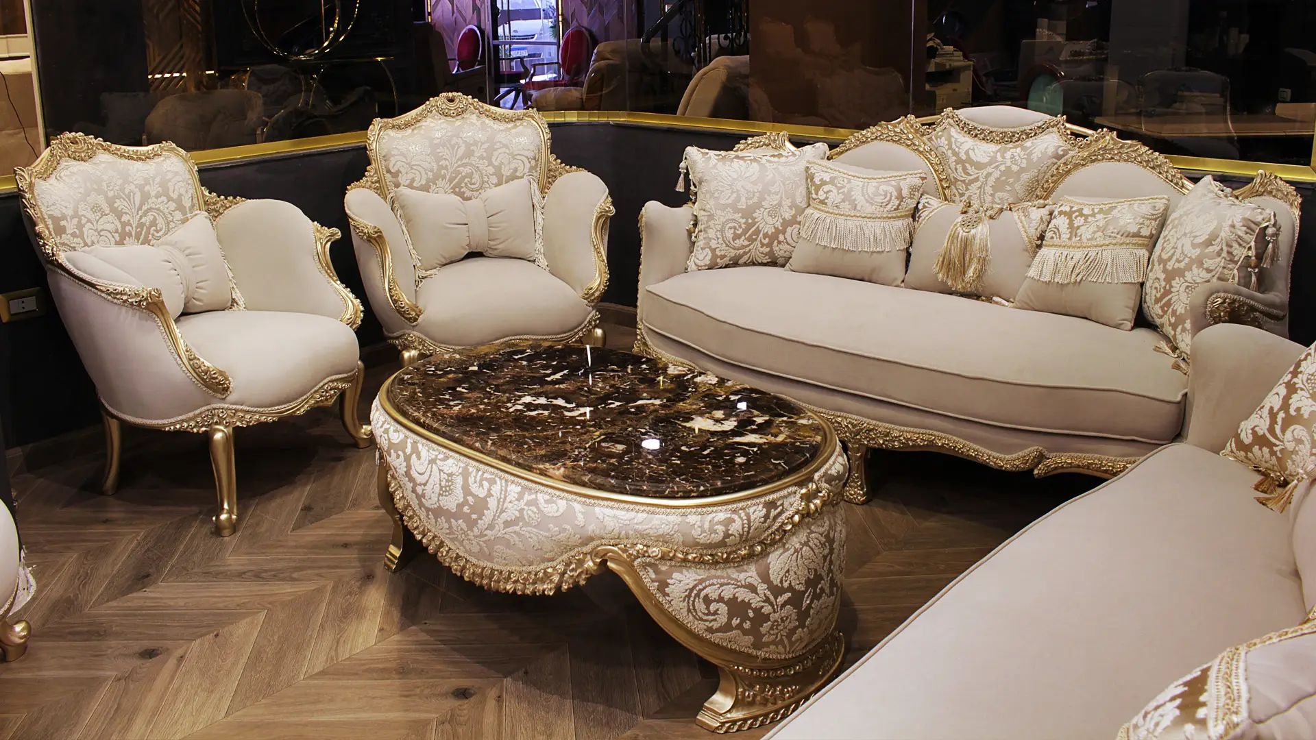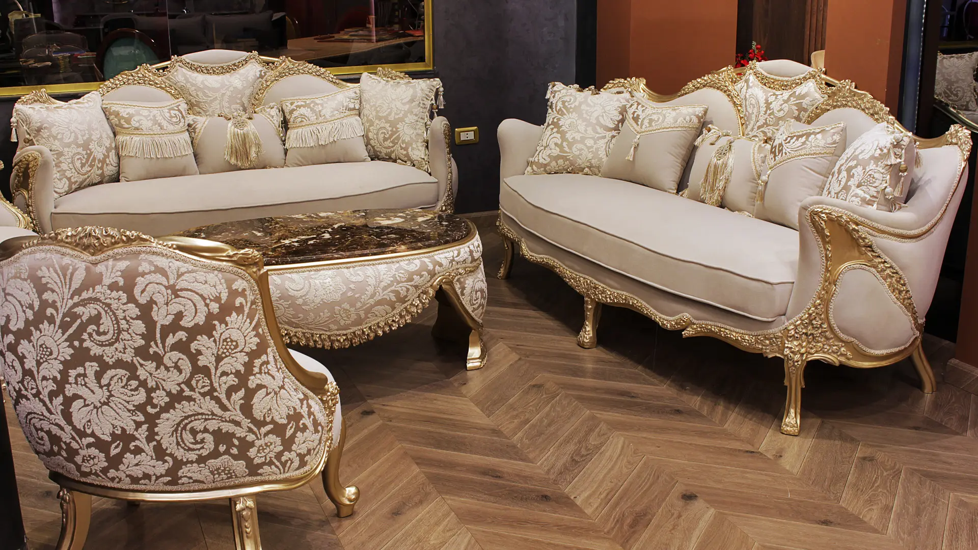 - كل قطعة في هذا الصالون تتميز بجمالها الغني، وهي مُصمَّمة من خامات راقية تتناغم مع بعضها البعض بأسلوب بالغ الجمال.