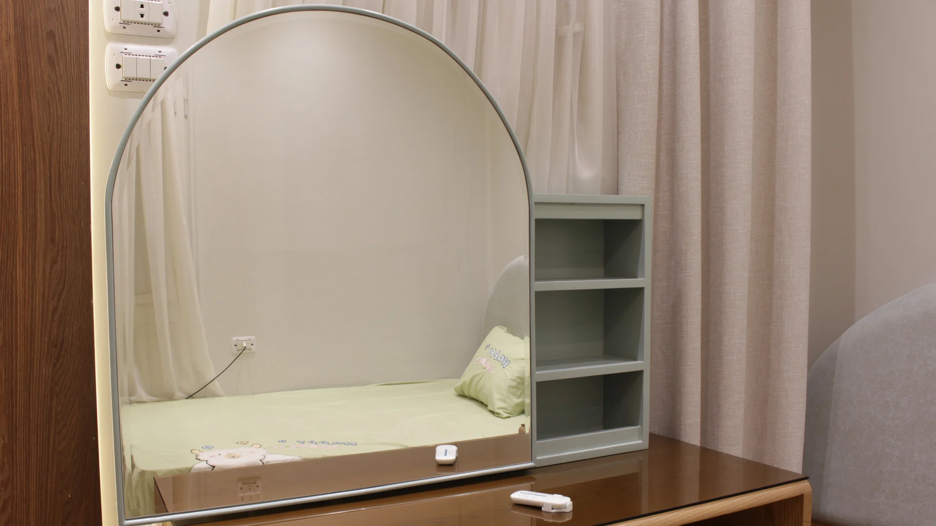 - أرفف مخفاه خلف مرآة التسريحة حيث يضع طفلك أغراضه الخاصة ويشعر بالخصوصية.