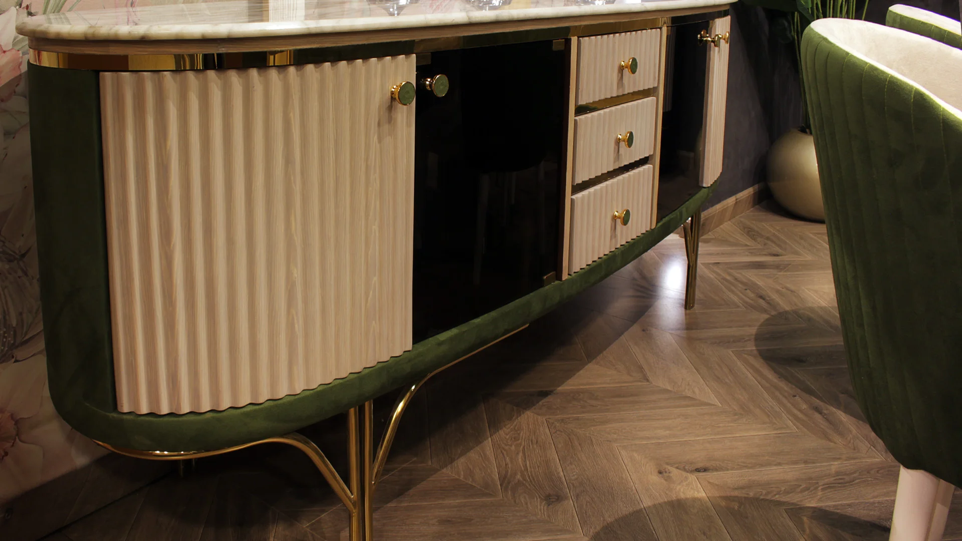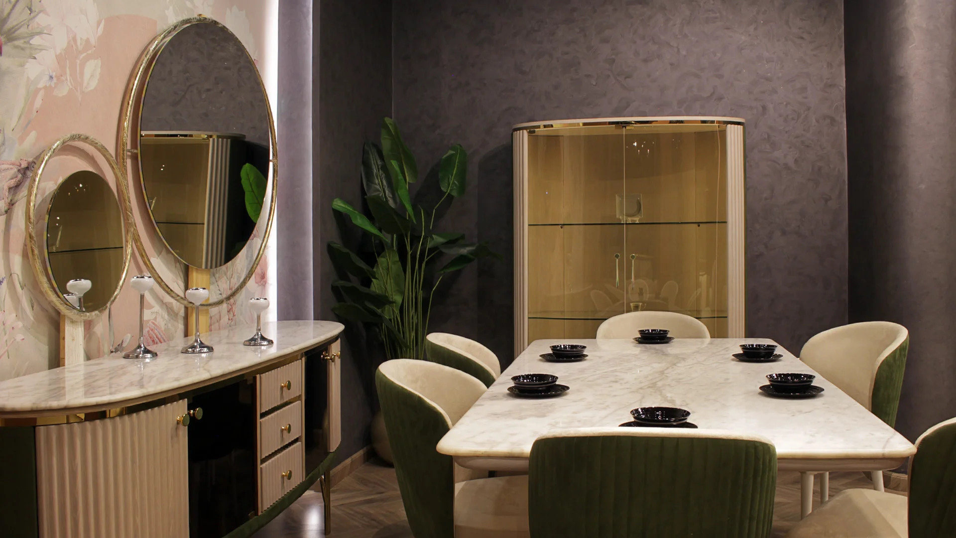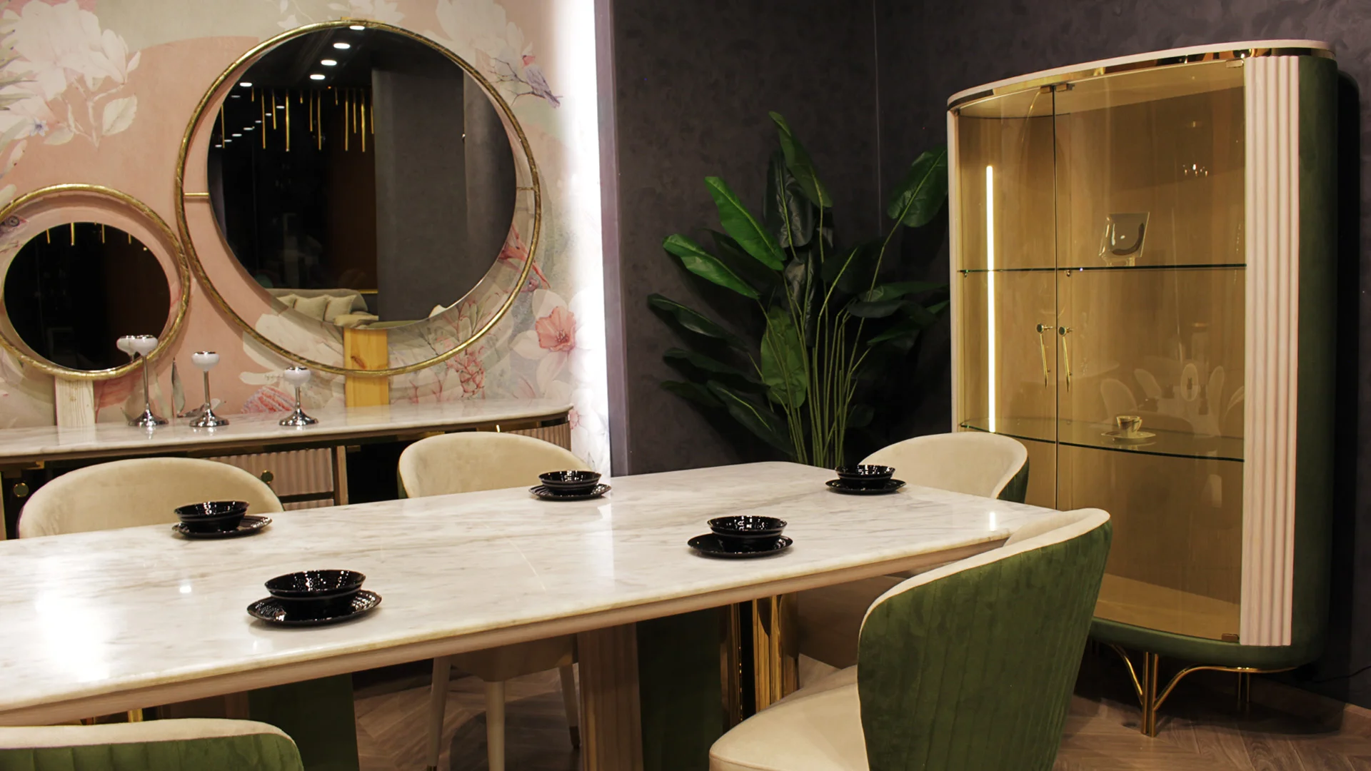- سفرة أنيقة تمنح غرفة طعامك أناقة ليس لها حدود، لها نيش وبوفيه بتصميم بيضاوي أنيق، بأرجل معدنية ذات لون ذهبي خلاب.
