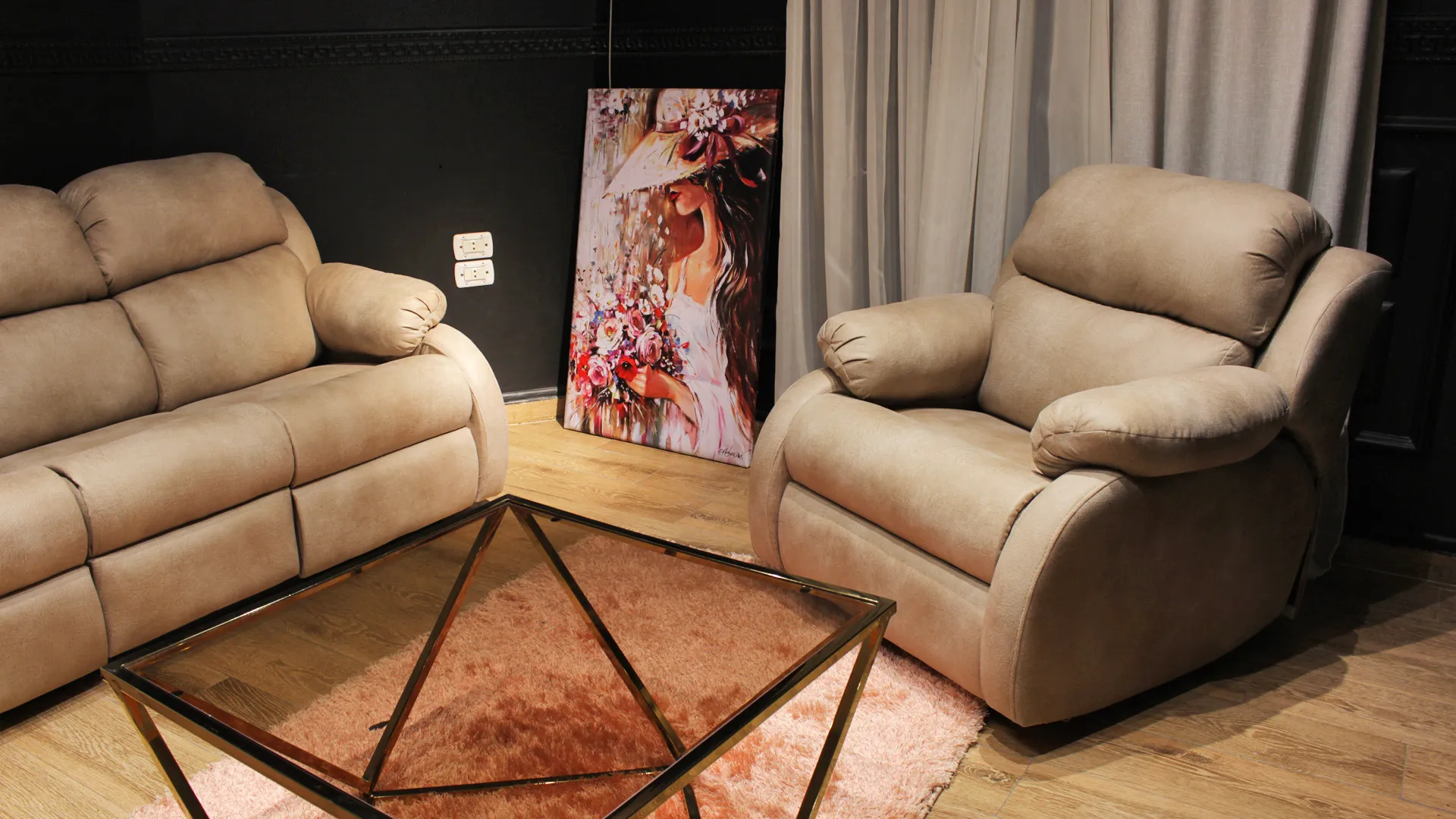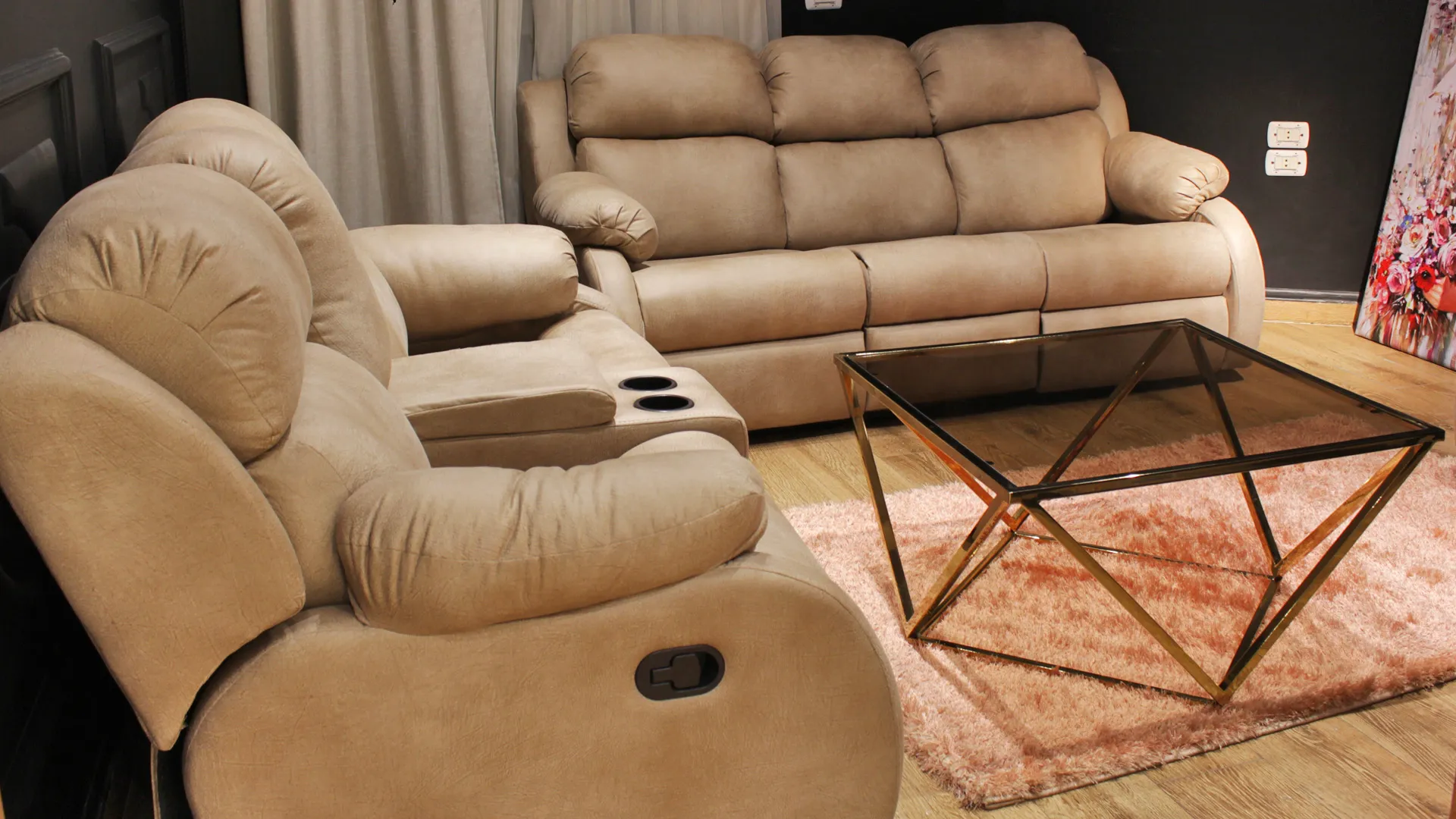 - مكون من كنبة ثنائية وكنبة ثلاثية وفوتيه متحرك (ريكلاينر).